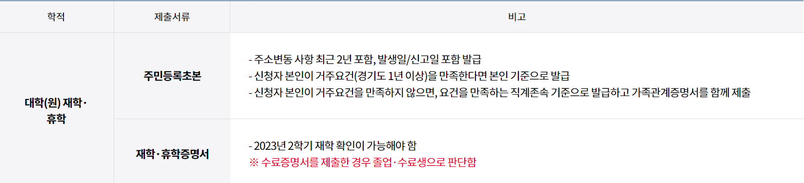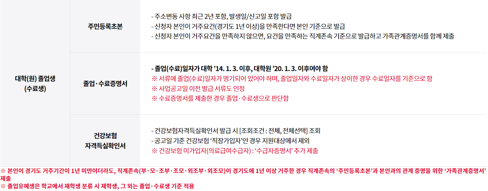 - 본인 또는 직계존속 중 1명이 / 주민등록상 경기도에 / 사업공고일 기준 1년 이상 계속 거주한 / 대학(원) 재학·휴학생, 대학(원) 미취업 졸업·수료생