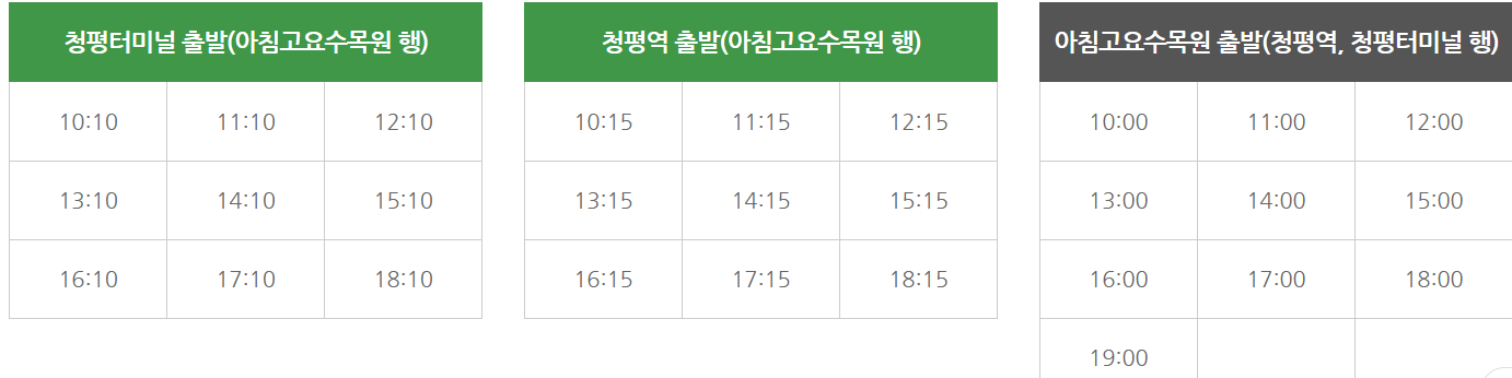 : 터미널(동서울, 지방터미널 등) 또는 청량리 환승센터 1번에서 출발하여 청평터미널 도착