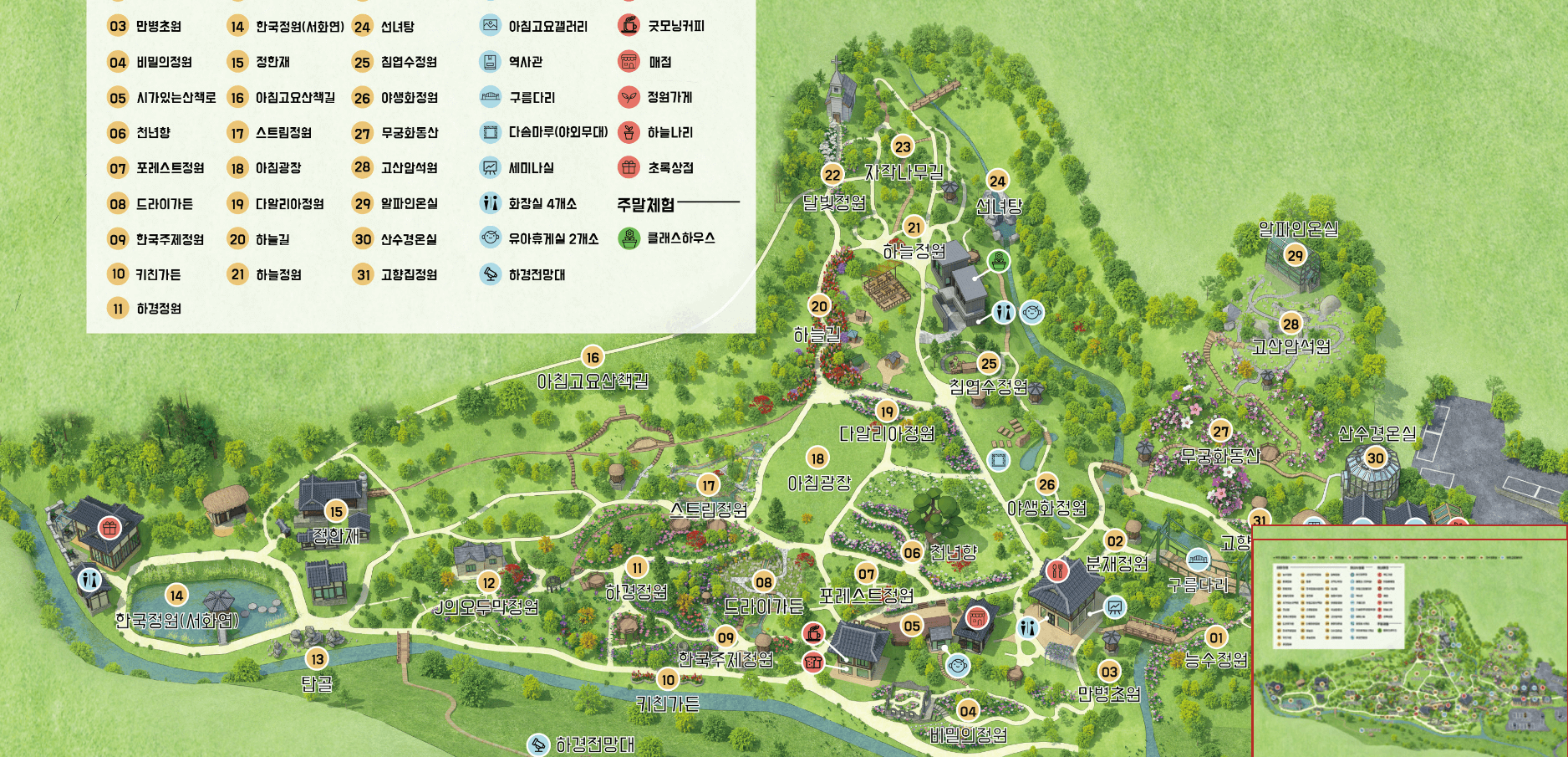 사계절 내내 푸른빛, 연둣빛이 시원한 침엽수 정원은 우리나라 특산식물인 구상나무와 황금빛을 띠는 황금 실화백, 은정 가문비나무 등 20여 종의 다양한 색감의 침엽수가 가득합니다. 침엽수 정원 한편에 위치한 미니어처 정원에는 가든레일이 조성되어 있어 어린이들의 사랑을 받는 정원입니다.