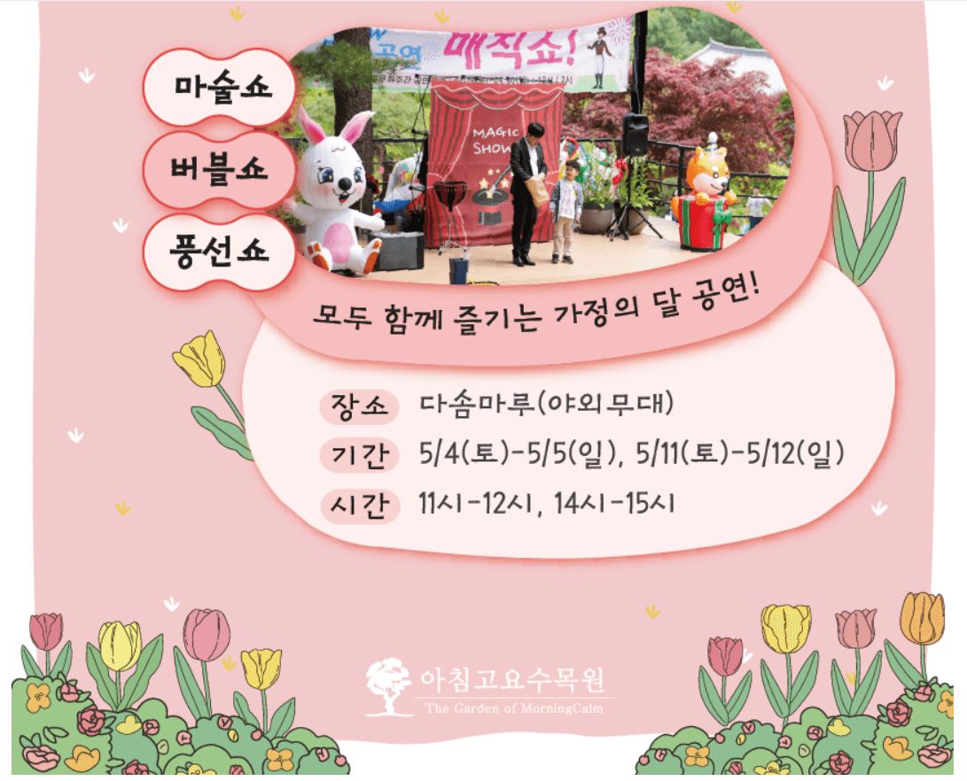 가정의 달 5월이 되면서 서울근교의 갈만한 곳을 찾는 분들이라면 가평 아침고요수목원을 추천합니다. 서울에서 가까워 자가용을 이용해서 갈 수 있는 거리이고 대중교통으로도 가능한 거리입니다. 아침고요수목원에서 지금 열리는 봄꽃페스타에  대한 정보와 주차 대중교통을 이용하는 방법에 대해서 알아보았습니다.