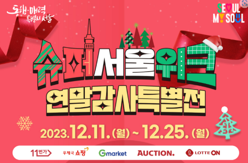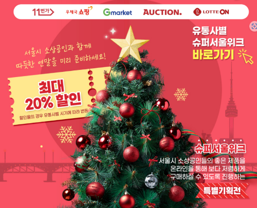 5개 국내 대표 온라인몰에서 12월 11일(월)부터 25일(월)까지 단 15일간 연말맞이 최대 20% 할인 혜택을 누릴 수 있는 슈퍼서울위크 연말감사특별전을 연다고 합니다. 행사기간과 참여한 곳, 참여방법에 대해서 살펴보려고 합니다