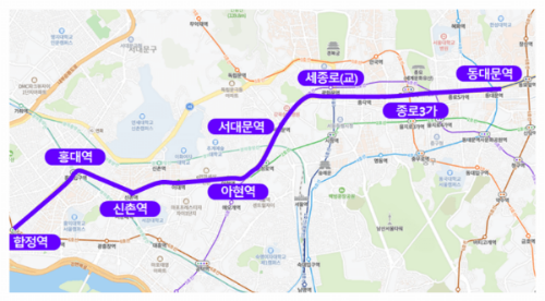 합정역~홍대입구역~신촌역~아현역~서대문역~세종로(교)~종로1가 ~종로 5가~동대문역(흥인지문)