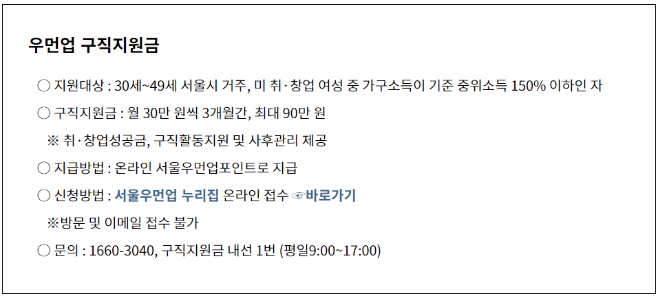 서울우먼업 프로젝트 운영 대표전화: 1660-3040, 구직지원금 내선 1번 (평일9:00~17:00)