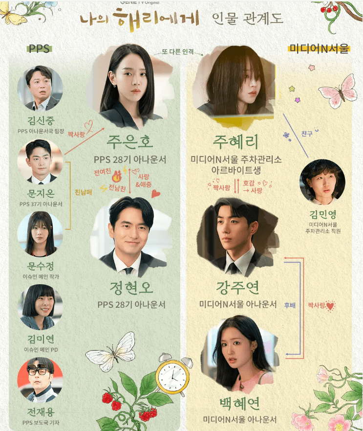 이 중 신혜선은 존재감 없는 14년 차 아나운서 ‘주은호’ 역과 주차장 관리소 직원 ‘주혜리’ 역을 맡아 1인 2역으로 역대급 존재감을 나타내고 있습니다. 남자주인공 이진욱은 아나운서국의 스타이자 호감도 1위 엄친아 아나운서 ‘정현오’ 역을, 강훈은 순수한 영혼의 모태솔로 아나운서 ‘강주연’ 역을 맡아 두 가지 색 로맨스를 보여줄 것 같습니다.