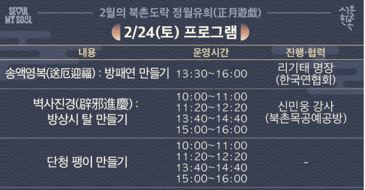 북촌 한옥마을에서는 방패연, 탈, 팽이, 공깃돌 만들기 , 부럼과 귀밝이술을 이용한 행사가 가족단위의 2월 서울 가볼 만한 곳 것 같습니다.