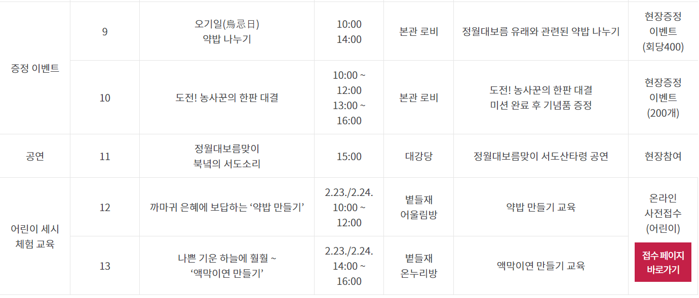 국립민속박물관 본관과 파주관에서 이틀 동안 정월대보름 민속행사와 액운을 쫓는 만들기 체험까지 정말 많은 행사가 준비되어 있네요. 본관과 파주관이 행사 내용이 다르고 대부분의 행사가 본관에서 열립니다. '국립민속박물관 홈페이지 > 세시풍속 행사'로 접속해서 행사 시간표 참고하셔서 방문해 보세요.