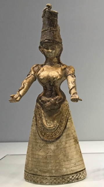 뱀의 여신: 크레타 섬의 크노소스 궁전에서 발견된 것으로 꽉조 허 리오 인해 가슴이 더 두드려 보인다. 당시에는 이 스커트의 직물과 같은 무늬 직물이 유행했으며 붉은색, 노란색, 검은색, 푸른색, 흰색 등 색도 다양했다. 짧은 소애와 몸에 꼭 끼는 보디스를 착용하였고, 허리에는 밖으로 나온 코 슬릿(코르셋과 브래지어를 합친 여성용 속옷)으로 허리를 조이고 가슴을 높이기 위해 입은 것으로 추정된다. 스커트의 원단은 무늬가 들어간 울이고, 태슬을 넣은 벨 세이프의 뻣뻣한 레이어드 스커트를 입었다. 머리에는 모자를 썼으며 모자 위의 동물상과 양손에 쥔 뱀으로 미루어 지혜와 다산을 상징하는 자연의 여신인 듯이 보인다.