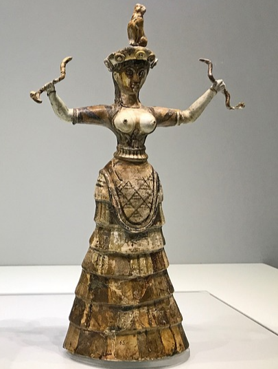 높이 솟은 모자를 쓰고 있는 뱀의 여신: 크레타의 뱀의 여신을 조각한 작은 파이앙스 입상들은 현재까지도 여러 점이 남아있다. 높이 솟은 모자를 쓰고 있으며, 모자 위에는 두 마리, 혹은 세 마리의 뱀이 몸을 둘둘 휘감고 있다. 에지에 자수가 두툼하게 들어간 에이프런은 뱀이 곡선 형상을 본뜬 것이다. 상의는 짧은 소매를 입고 양팔을 휘감은 뱀들이 보인다. 스커트는 여자 글만 입었던 노란색의 옷을 입고 스커트 아랫부분은 헴 라인을 빙 두른 그물 모양의 장식이 있다. 스커트 위로 재단으로 모양을 잡은 듯한 둥그런 에이프런을 둘렀다.