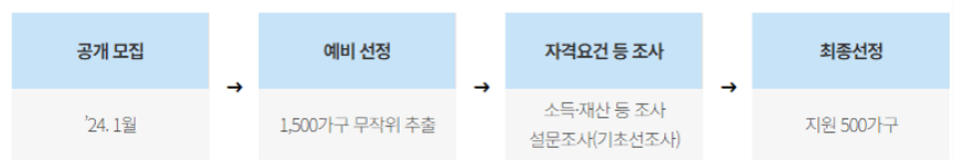 지원가구 선정은 신청자들을 통계적 무작위 추출방식으로 약 1,500 가구(3 배수 내외)를 예비선정하고, 자격요건에 적합한 가구인지 조사한 후 4월에 최종 500 가구를 선정할 예정이다.