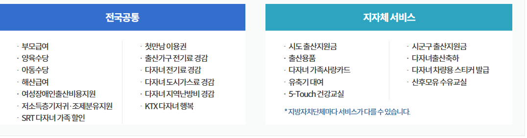 출산지원서비스: 전국 공통으로 지원하는 서비스와 지자체 서비스가 여러가지가 제공됩니다.