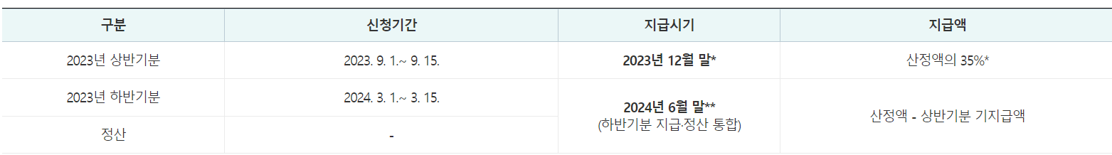 -지급시기: 3월 신청 한 경우... 6월 말 지급 (100% -12월 말 지급액)