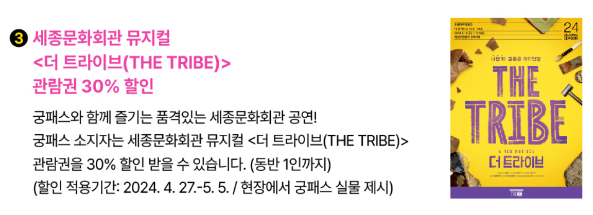 세종문화회관 뮤지컬 (더 트라이브 THE TRIBE)관람권 30%할인( 동반1인까지)