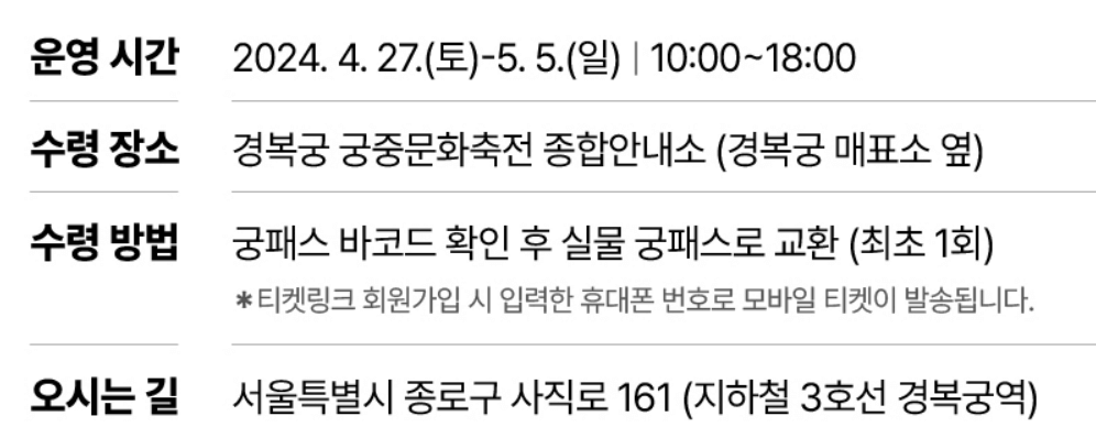 ㅇ수령장소: 경복궁 궁중문화축전 종합안내소(경복궁 매표소 옆)