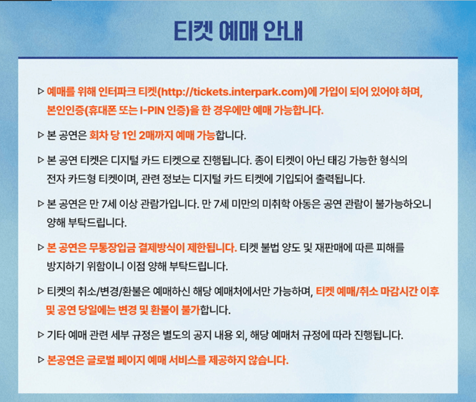 - 공연 당일 시야 방해로 인한 티켓 환불 및 변경은 불가능하오니 양해 부탁드립니다.